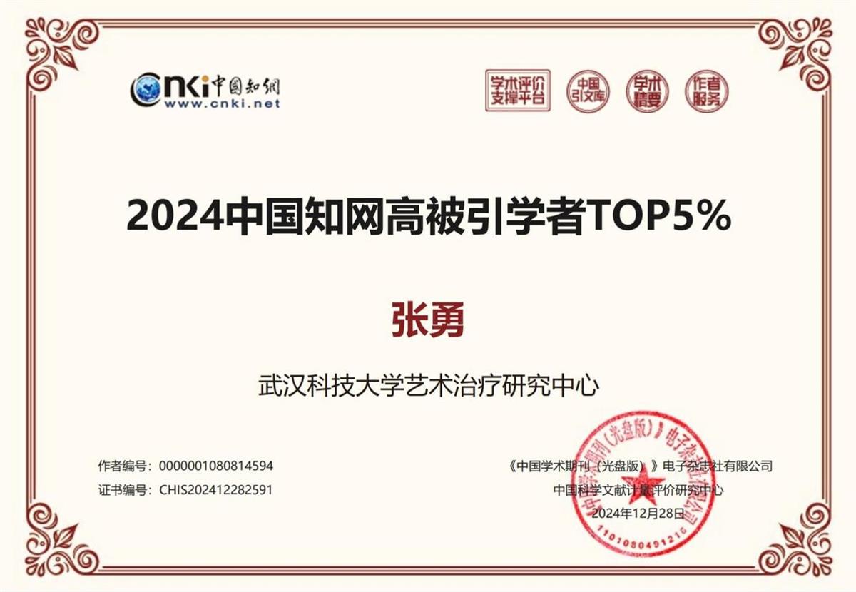 近日,中国知网公布“2024知网高被引学者”名单,中国知网中国科学文献计量评价研究中心基于中国知网收录的国内学术期刊论文和会议论文,2024年首次开展学者学术影响力客观评价,遴选了“2024中国知网高被引学者”名单,365完美体育艺术治疗研究中心音乐治疗学者张勇教授入选“2024中国知网高被引学者”TOP5%。