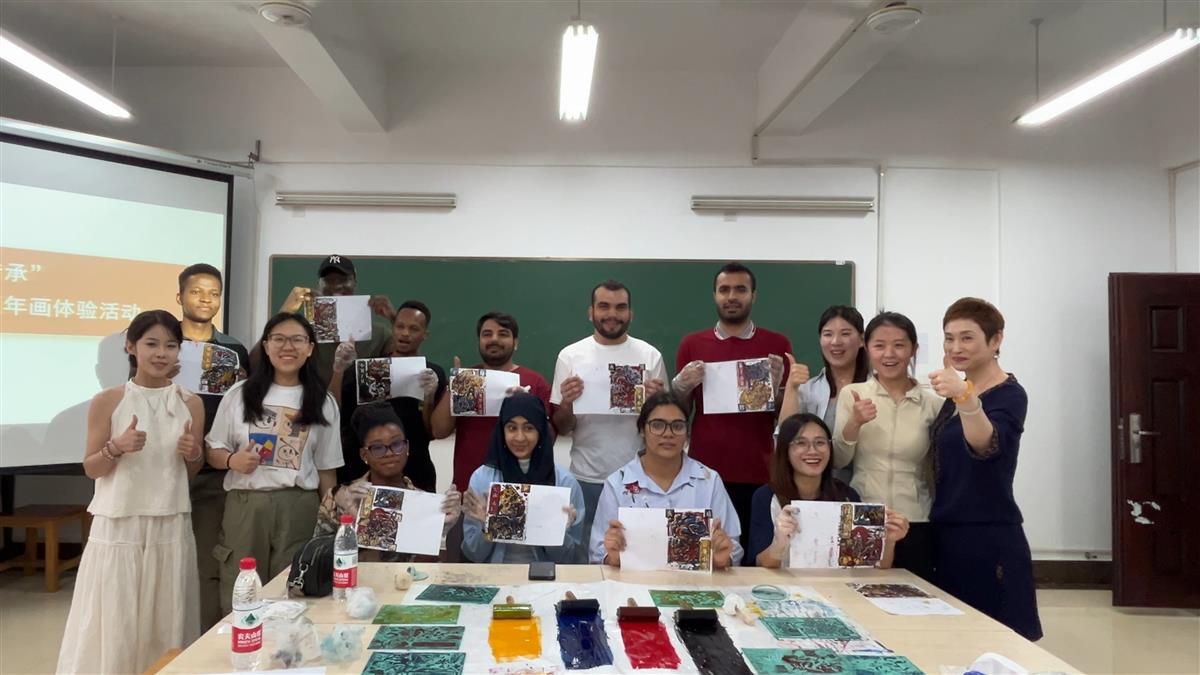 本次活动的核心体验项目,源自艺术与设计学院聂虹教授《传统文化与民间艺术实践》课程的成果转化。面对非遗技艺在普及传播中的挑战——武强木版年画套色繁复、植物扎染工艺参数难控、板鹞风筝工序冗杂,师生团队迎难而上:优化木版刻制流程,实现图案精简化与色彩标准化;通过大量实验,确立扎染染色参数与布料处理规范;改良风筝竹条处理与骨架组装工艺。经反复打磨,成功将精深技艺转化为适合国际学生体验的互动项目,为沉浸式文化课堂奠定了坚实基础。