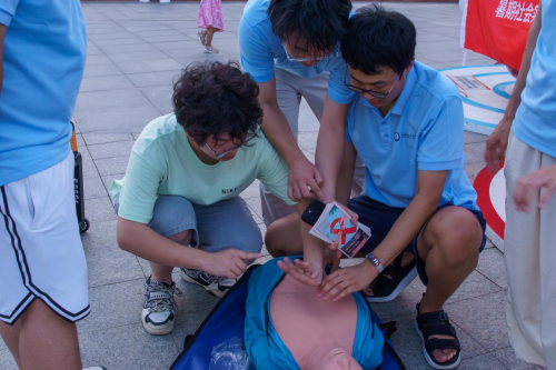 活动现场,实践队成员搭建起简易“急救课堂”,通过实物教具讲解形式,将专业术语转化为通俗易懂的“家常话”。“大家可以把胸腔想象成一个打气筒,按压就是通过外力推动心脏泵血,所以力度和节奏一定要准。”实践队成员刘宇航一边手持人体模型演示,一边用比喻帮助市民理解原理。