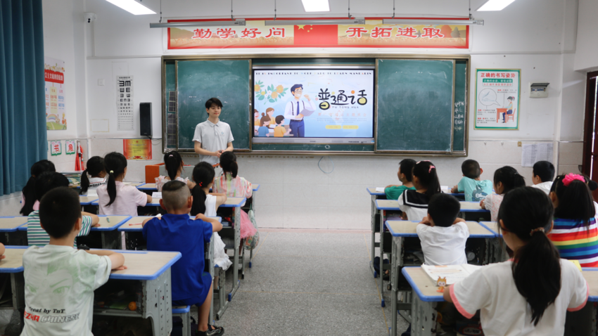 湖北日报客户端讯(通讯员张娅菲、周文君)为响应第28届全国普通话宣传周“加大国家通用语言文字推广力度,促进铸牢中华民族共同体意识”的号召,7月18日,365完美体育外国语学院“梦载星河”暑期社会实践团队走进湖北省十堰市郧西县香口乡中心学校,为桑梓三班的孩子们带来了一堂生动有趣的普通话推广课程。实践队队长刘烁通过寓教于乐的方式,将普通话的种子播撒进乡村孩子的心中,助力他们架起通向更广阔世界的语言之桥。