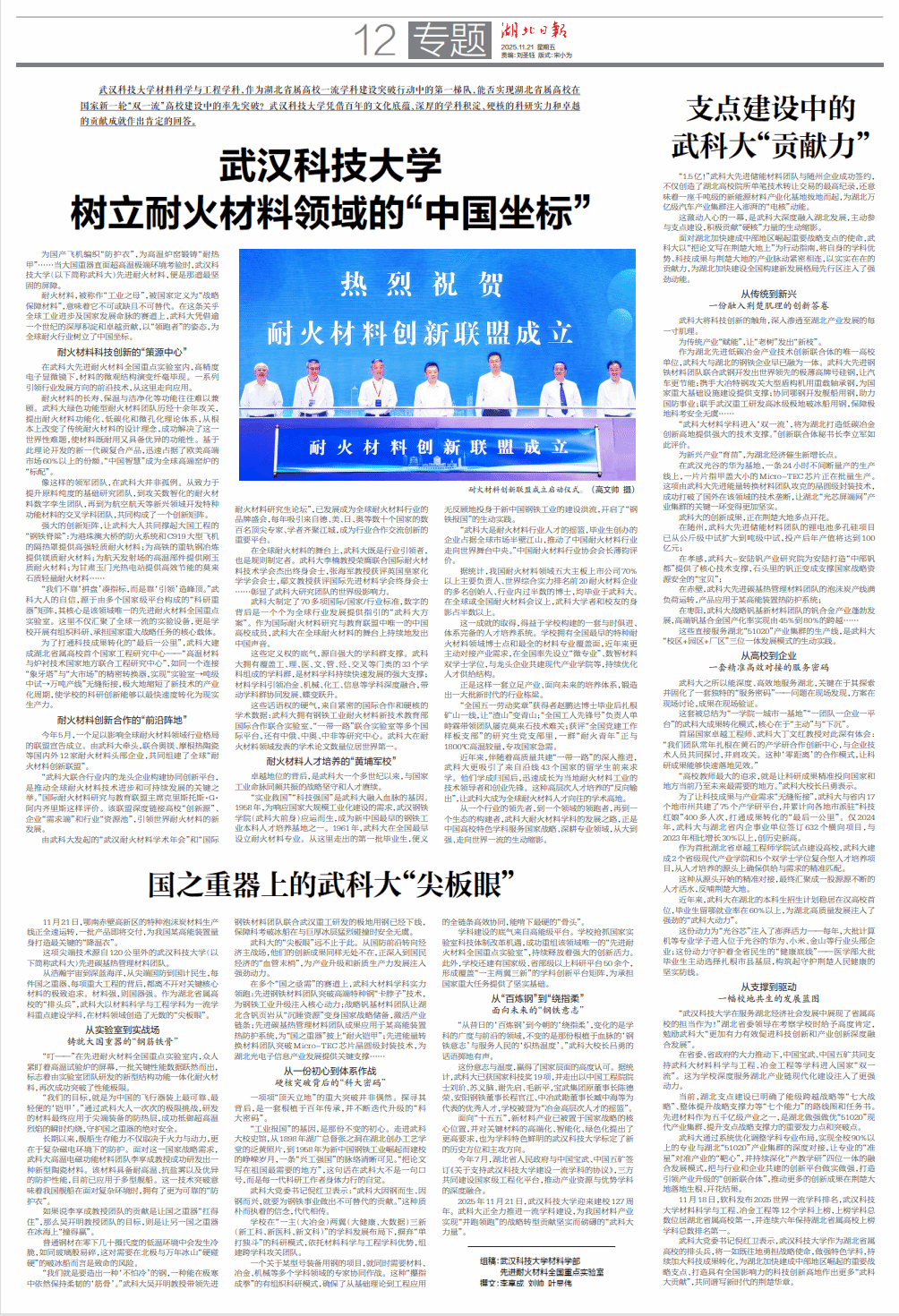 作为湖北先进低碳冶金产业技术创新联合体的唯一高校单位,武科大与湖北的钢铁企业早已融为一体。武科大先进钢铁材料团队联合武钢开发出世界领先的极薄高牌号硅钢,让汽车更节能;携手大冶特钢攻关大型盾构机用重载轴承钢,为国家重大基础设施建设提供支撑;协同鄂钢开发舰船用钢,助力国防事业;联手武汉重工研发高冰级极地破冰船用钢,保障极地科考安全无虞……