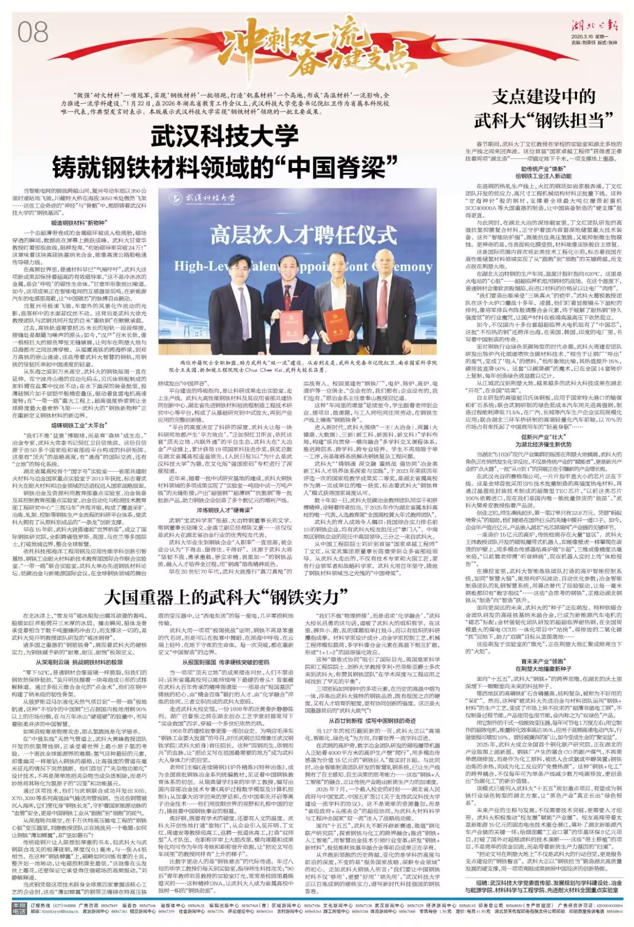 面向“十五五”,武科大不断开辟新赛道,做强“钢化联产研究院”,探索钢铁与化工的跨界融合;推进“钢铁+人工智能”,用智慧冶金技术引领行业变革;研发“钢铁+新材料”,极低能耗铁基非晶合金等前沿成果正在孕育。