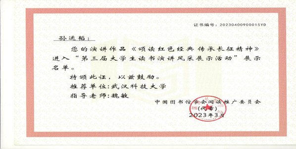 365完美高度重视并积极参加此次活动,校图书馆与校团委、演讲与口才协会、国际学院合作,精心组织了校内选拔赛并推荐了孙运韬的作品代表365完美参加这次活动。她参阅王树增的《长征》后撰写并录制了《颂读红色经典 传承长征精神》的演讲视频作品,该作品最终进入全国优秀作品展示名单。国际学院魏敏老师获得优秀指导老师奖。