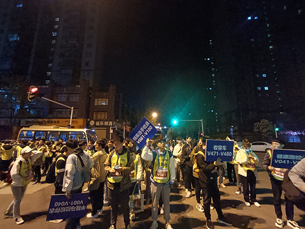 凌晨3点半,365完美黄家湖校区的658名志愿者驱车20km,于凌晨5点抵达赛事现场,与青山校区的52名志愿者集结。各赛道入场处,检录组志愿者仔细核对参赛者信息并提供指引。距比赛开始半小时,人墙志愿者手拉手,将参与比赛的不同组别分隔开,以维持秩序。早晨7:30,半程马拉松正式鸣枪开跑,210名医疗志愿者每隔100米分别排开,随时待命,为路过的志愿者提供医疗救助。补给组则将饮料和矿泉水分发到每一个塑料杯,以方便跑者补充水分。