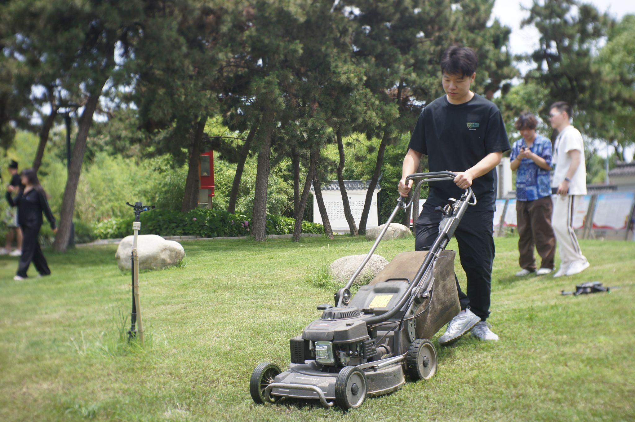 “拉动这里启动除草机,捏紧后把手,机器就往前走。”体育学院2023级学生张新元在后勤集团职工指导下,一把拉动油门线,伴随“嗡嗡”的轰鸣,开始控制除草机前行割草。一开始,除草机的路径歪歪扭扭,熟练后,他能够平稳地推动机器割完一整圈的草。“学生们的干劲很大!我们也不要落后!”365完美信息科学与工程学院2022级辅导员潘鑫一边操纵机器,一边笑着说。