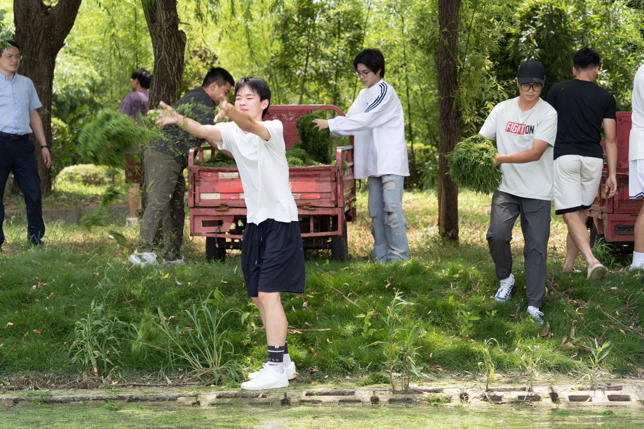 师生齐力割完草坪,装满了整整两车草料,运往沁湖边喂鱼。“那儿有鱼!快去投一些草,让它们都能吃到!”老师、学生们各自在三轮车上抓来两大把草料,在岸边糅合成一团,蓄力后向前方撒去,让其更均匀地落在湖面上。