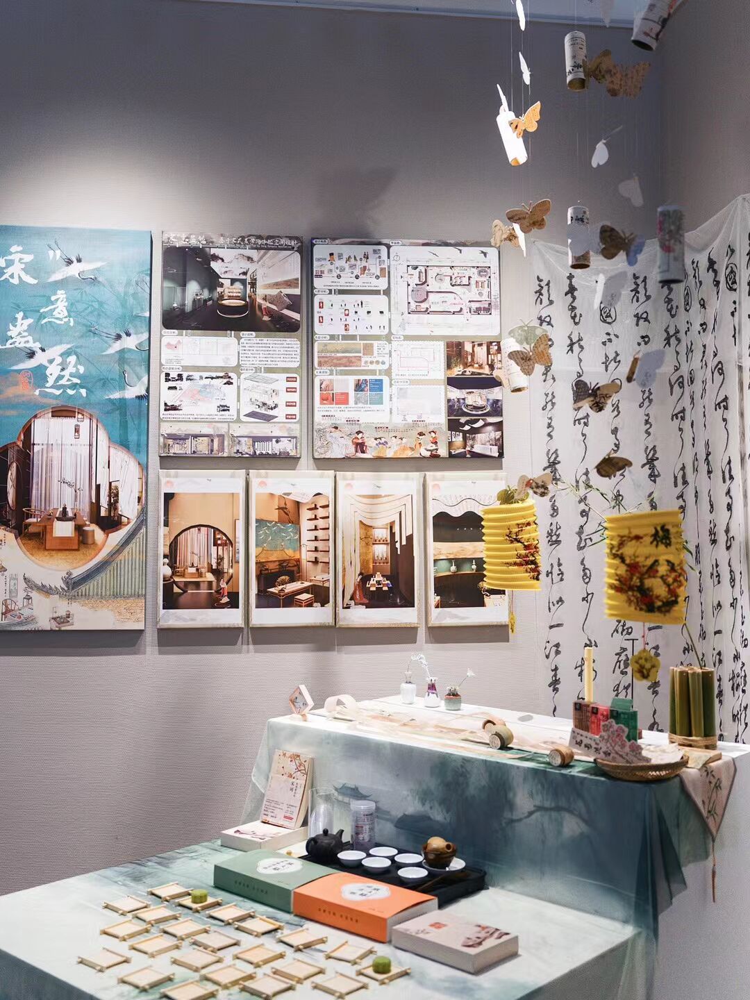 “宋代园林效法自然却又高于自然。”与张哲晗同专业的华秋雨选用温和自然的色彩搭配,结合现代复现的清明上河园设计,用三维立体模型视频及木材、石材制作的真实模型打造了一个宋式园林体验中心。展出当天,华秋雨兼职“茶娘”,观赏者可以在展位上向“茶娘”讨壶茶喝,就着点心细细品味。信息学院学生李周阳边喝茶边和“茶娘”夸赞“茶馆”风景静谧唯美,表示仿佛真来到了以前游玩过的苏州园林。喝完茶后,李周阳又到隔壁展区听音乐、做漆扇。