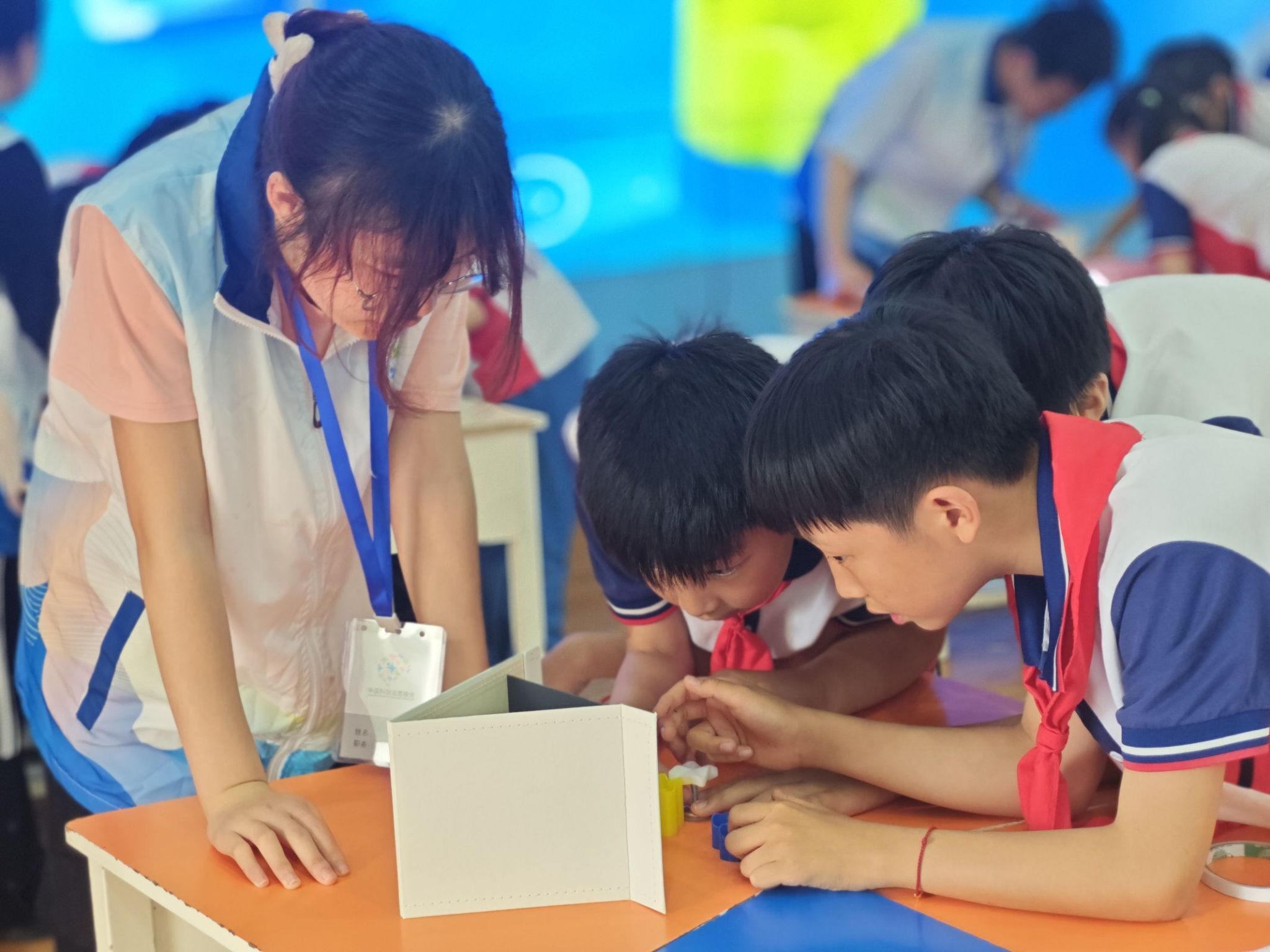 因为酸碱环境不同,显色剂会使溶液出现不同的颜色,小学生们在志愿者的引导下分小组亲自动手开展溶液显色反应实验。“耶,成功了,溶液变蓝了!”随着显色剂的加入,原本无色的溶液纷纷呈现出五彩斑斓的颜色。小学生们完成了红、橙、黄、绿、青、蓝、紫七个不同的显色反应,对应彩虹的七种颜色,在即将迎来六一儿童节的时候,小学生们在趣味科普实验中收到了志愿者们送给他们的“彩虹”。