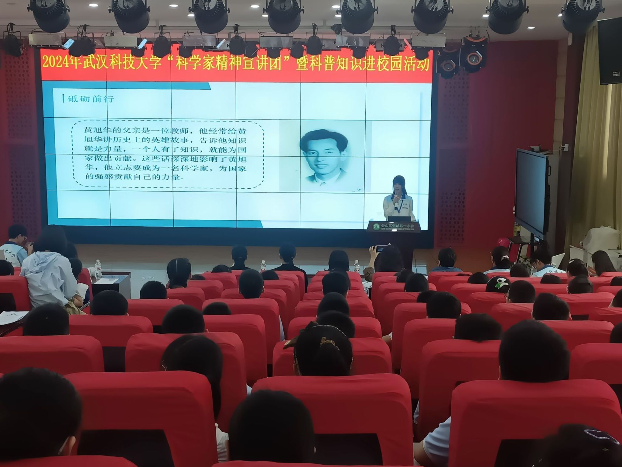 志愿者以中国核潜艇之父-黄旭华、中国氢弹之父-于敏、中国现代数学之父-华罗庚三位伟大的科学家为例,为160余名小学生讲述了他们人生中的重大历史事件关键时刻、重要节点,以及科学家的生活工作心得、所思所想以及对后辈的情意殷殷与期许。志愿者为小学生们详细解释了黄旭华院士的研究经历,隐姓埋名三十年,家人遭难他未能照顾、父兄逝世他没有送行,困窘批斗不堕其志、委屈误解不鸣其冤,舍小家顾大家,终以其铸就的国之重器换来家人的理解和敬佩。从黄旭华院士三十年未曾归家的坚守、于敏院士为国铸剑的信念再到华罗庚院士英国求学经历,小学生们通过志愿者的讲解,从科学家的科研经历中去领会什么是科学家精神。