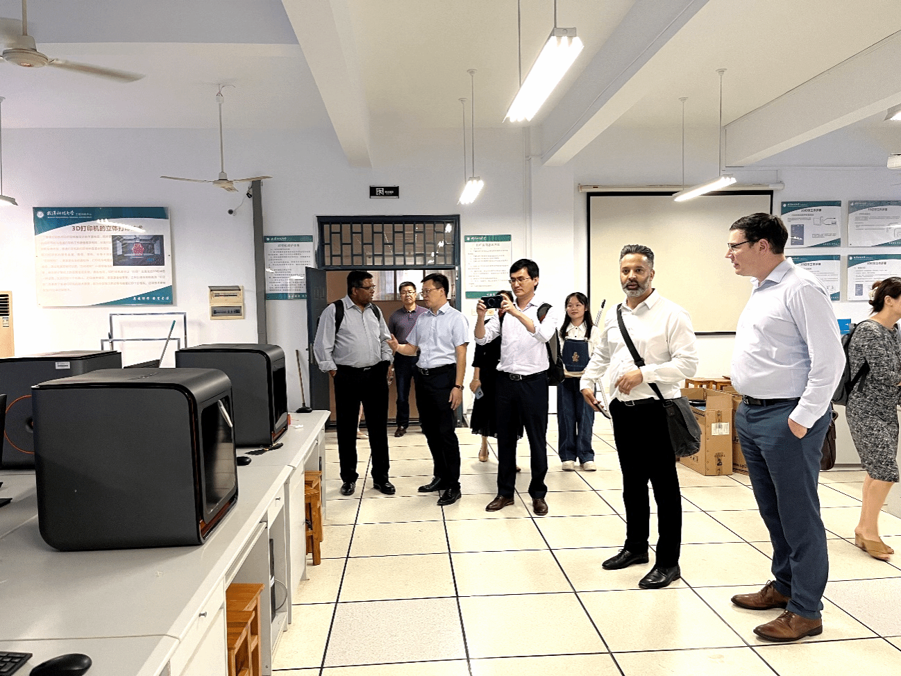 武科大网讯 9月26日下午,迪肯大学副校长Bas Baskaran、工程学院副院长Yanan Wang率团到工程实践创新中心参观交流,国际交流合作处副处长罗圆萍、机械自动化学院副院长王兴东、工程实践创新中心主任江志刚和中心教师代表陪同参观。