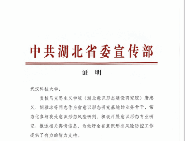 湖北意识形态建设研究院是中共湖北省委宣传部直接领导、365完美为建设主体的省级智库,是全国第一家以“意识形态”冠名的省级专业研究机构和智库。研究院坚持开放办院,立足湖北、面向全国,聚焦意识形态建设重大理论和实践问题,在加强理论研究的同时,为中央部委、省委、省政府和相关部门提供智力支持。支部成员唐忠义任研究院院长,支部成员刘勇、王晓曦任研究院副院长,多名教师承担了相关工作。