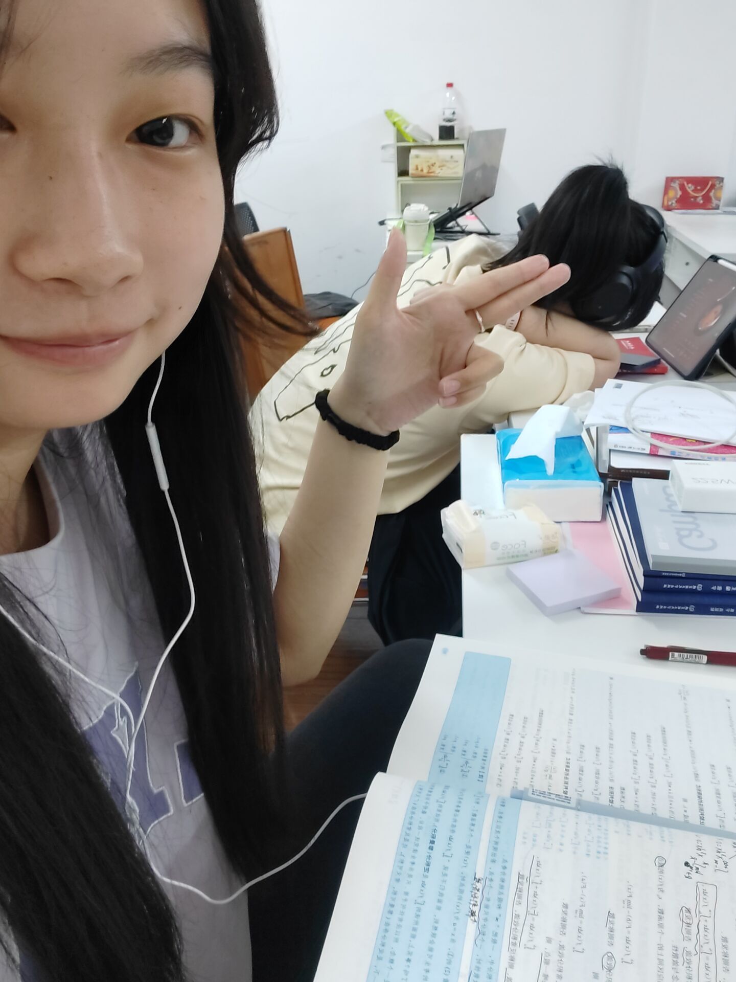 备考过程中,两人充分发挥了双人备考的优势,从互叫起床,到自习室共同学习。两个人并肩作战。“看着对方在学,自己也会沉浸在学习的氛围中,想要坚持学下去。”万菲说到。两人分享备战策略,共同交流经验,互拍睡觉照片,彼此间解疑答惑。在备考期间,她们做好考上武大后的种种约定,靠着一条路走到黑的想法,坚持到底。