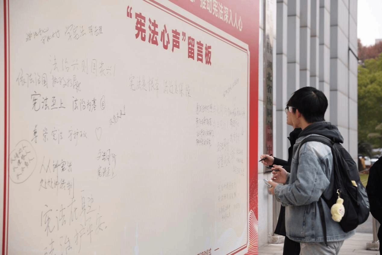 “宪法心声”创意留言区的大型展板前,师生们纷纷拿起马克笔,写下对宪法的理解和对青山区法治建设的美好期待,字里行间满是对法治精神的尊崇与向往。