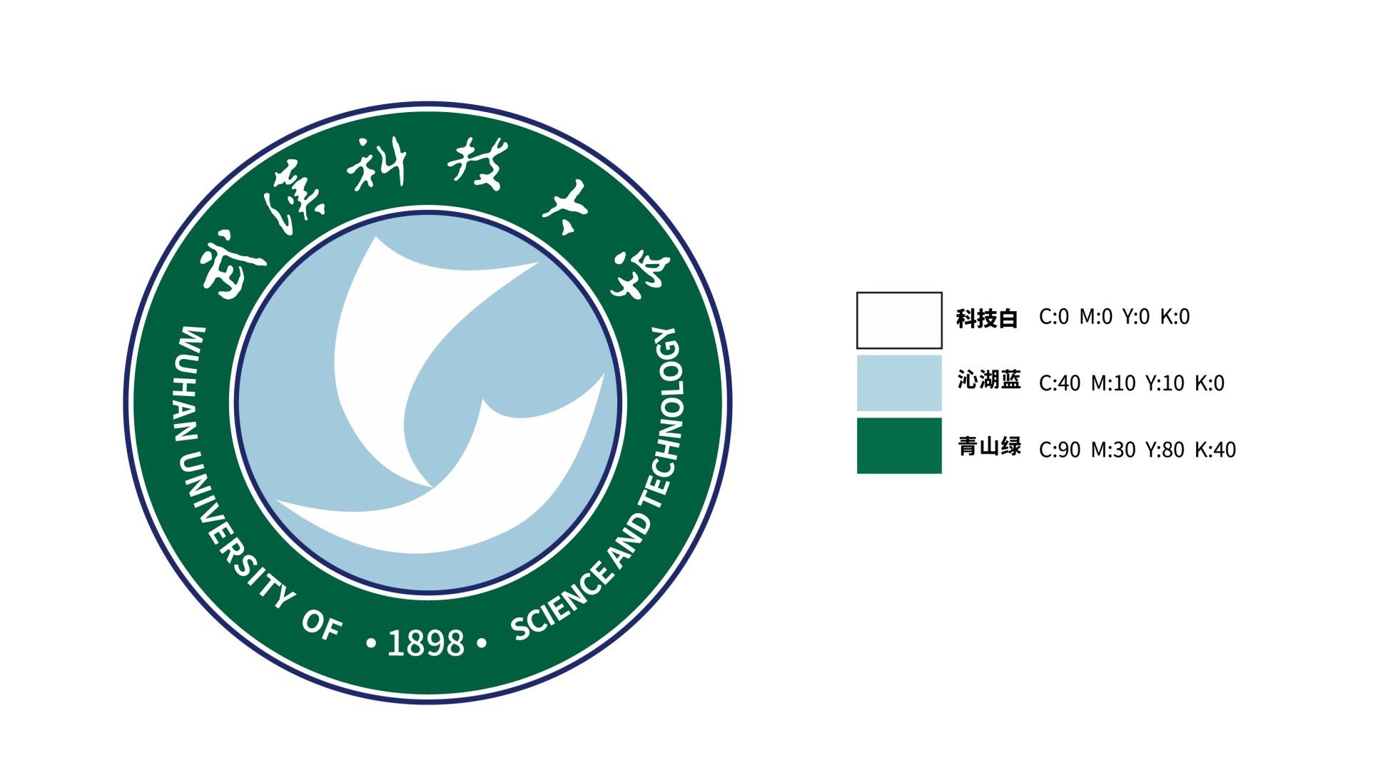 校徽主色调由科技白(C:0 M:0 Y:0 K:0)、沁湖蓝(C:40 M:10 Y:10 K:0)和青山绿(C:90 M:30 Y:80 K:40)三色构成。科技白象征创新、先进、严谨,代表学校优势特色的“大冶金”学科;沁湖蓝象征智慧、理性、未来,代表学校新兴交叉的“大数据”学科;青山绿象征生命、健康、青春,代表学校融合发展的“大健康”学科,三色组合凸显学校“一主两翼”的学科体系。同时沁湖蓝、青山绿也意喻“沁水青山”的美丽校园。 |